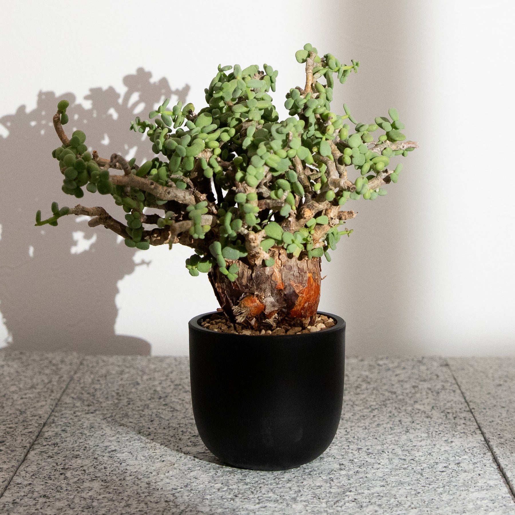 ミニマルな造形美と確かな存在感が魅力の塊根植物、ケラリア・ピグマエア(Ceraria pygmaea)。南アフリカ〜ナミビアにまたがるリフタスフェルトやリューデリッツ周辺の過酷な岩地に自生する、希少な小型コーデックスです。スベリヒユ科ケラリア属に分類され、硬く厚いチョコレート色の樹皮に包まれた幹は、ずんぐりとした塊根を形成し、小さな株でも古木のような風格を漂わせます。
