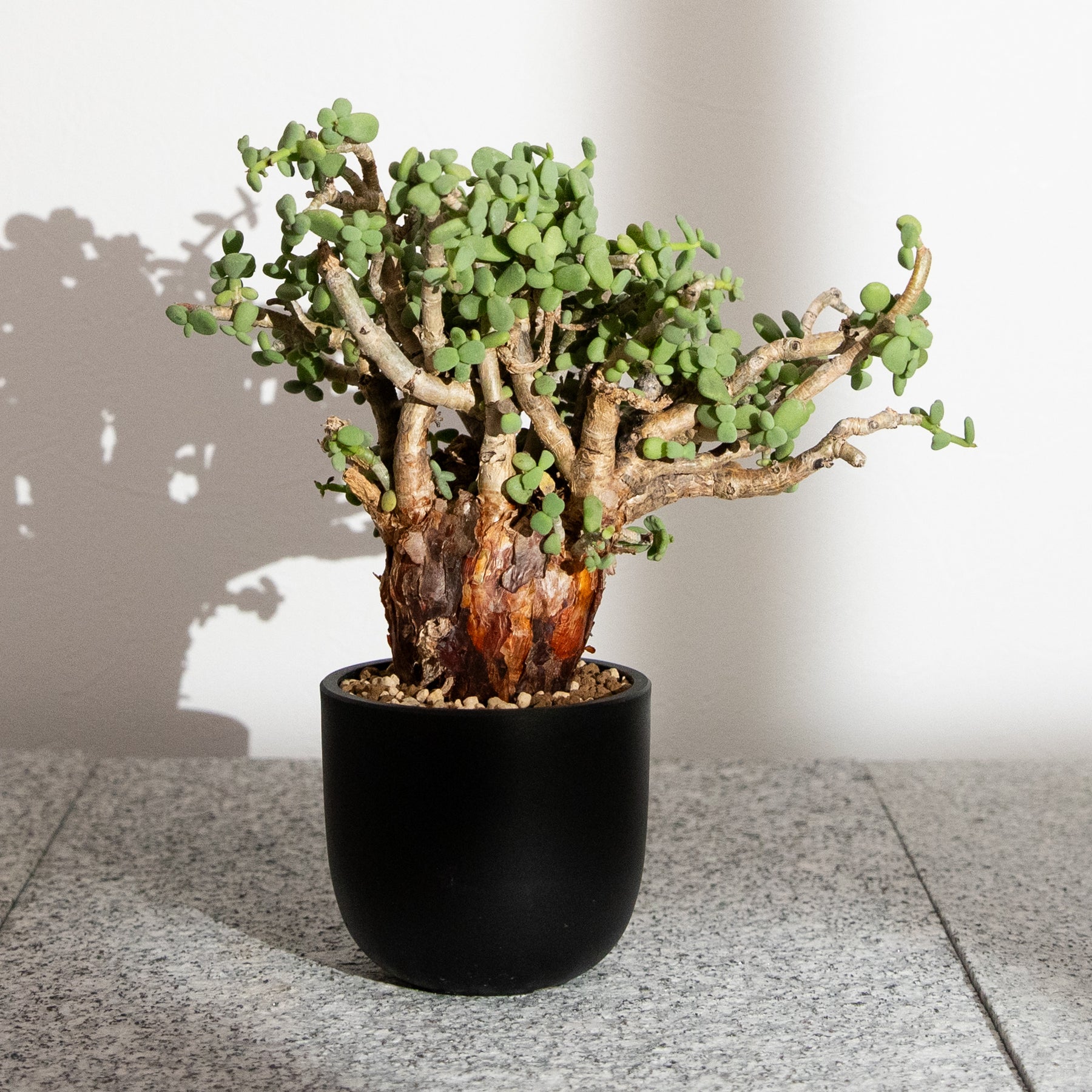 生長は極めてゆっくりで、直径10cmの幹を育てるにも長年を要します。挿し木での増殖も可能ですが、塊根は基本的に形成されないため、ケラリア・ピグマエア本来の魅力を味わいたい方には、実生株がおすすめです。雌雄異株の本種は、小さな白〜緑や薄いピンクの花を咲かせることもあります。