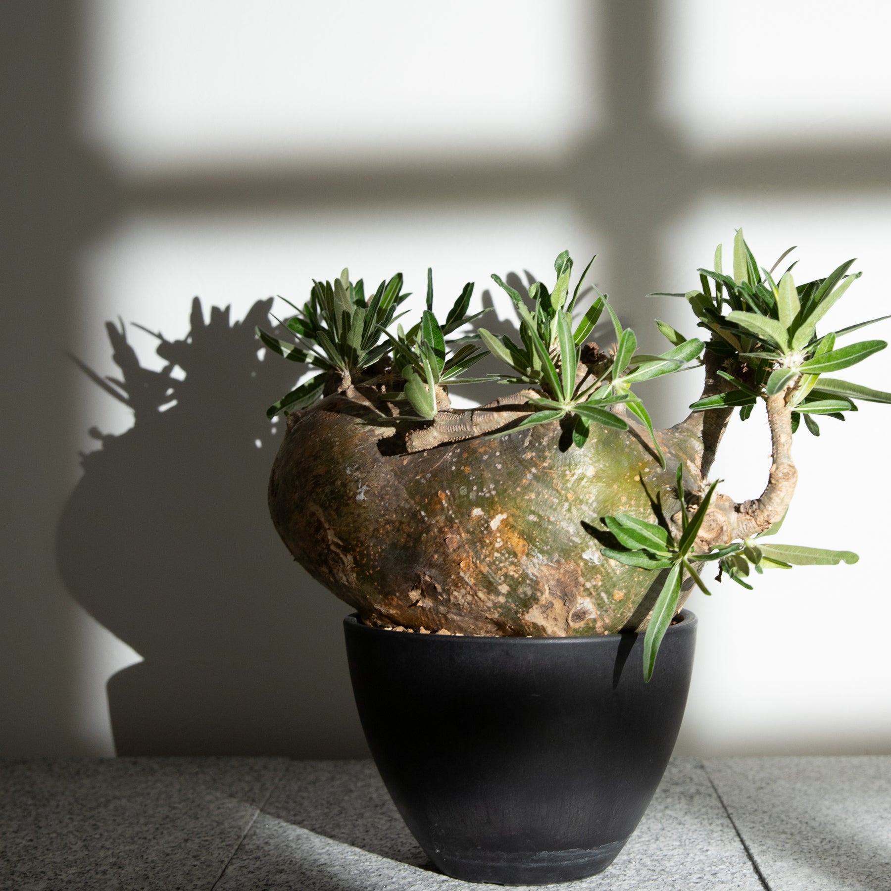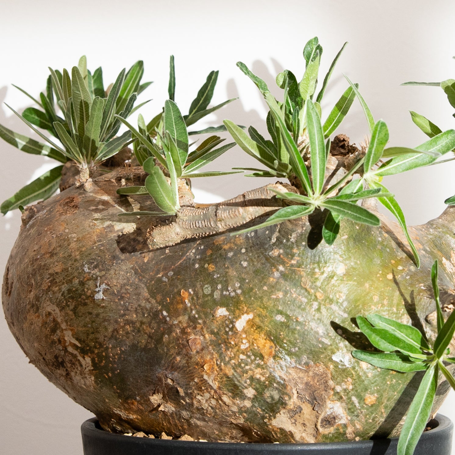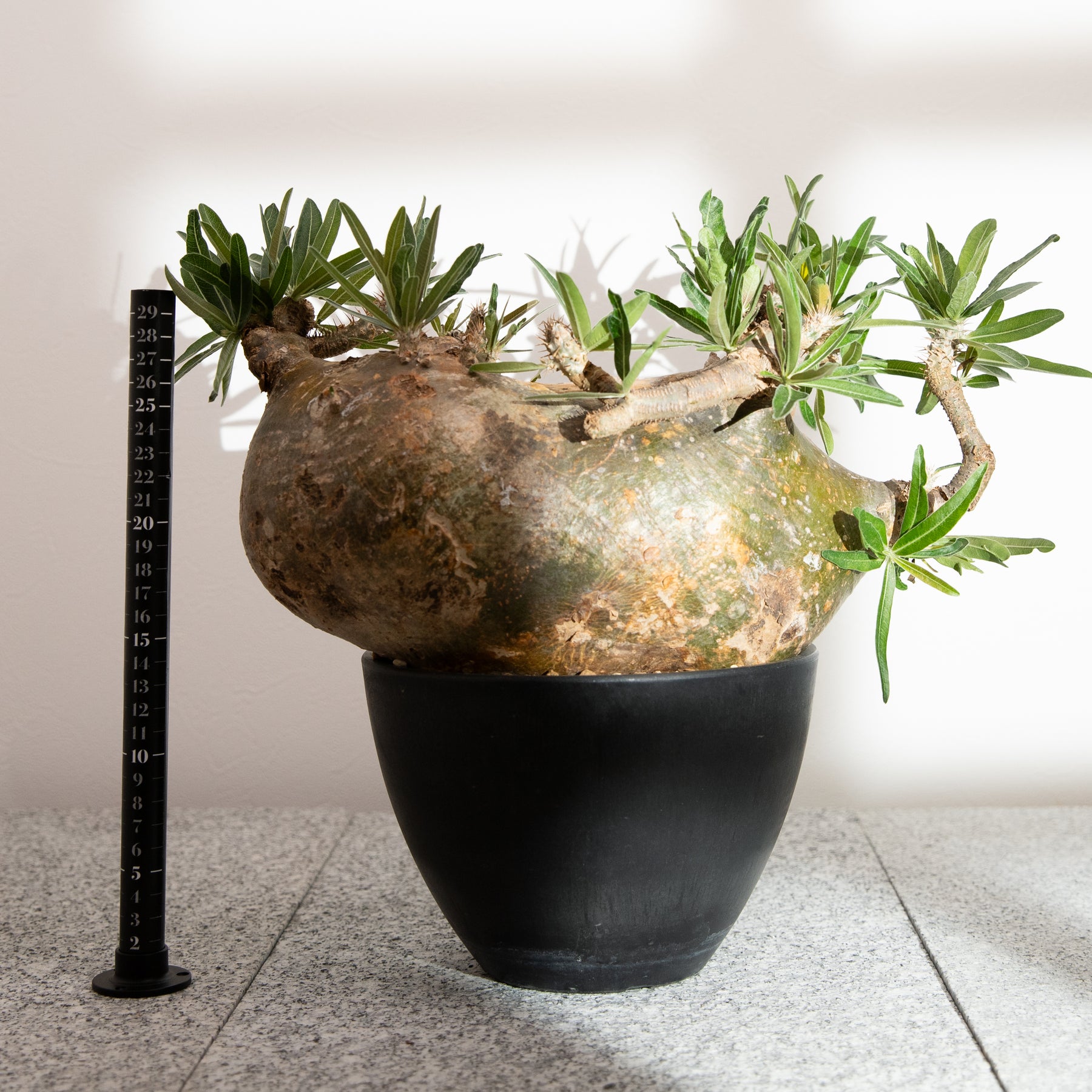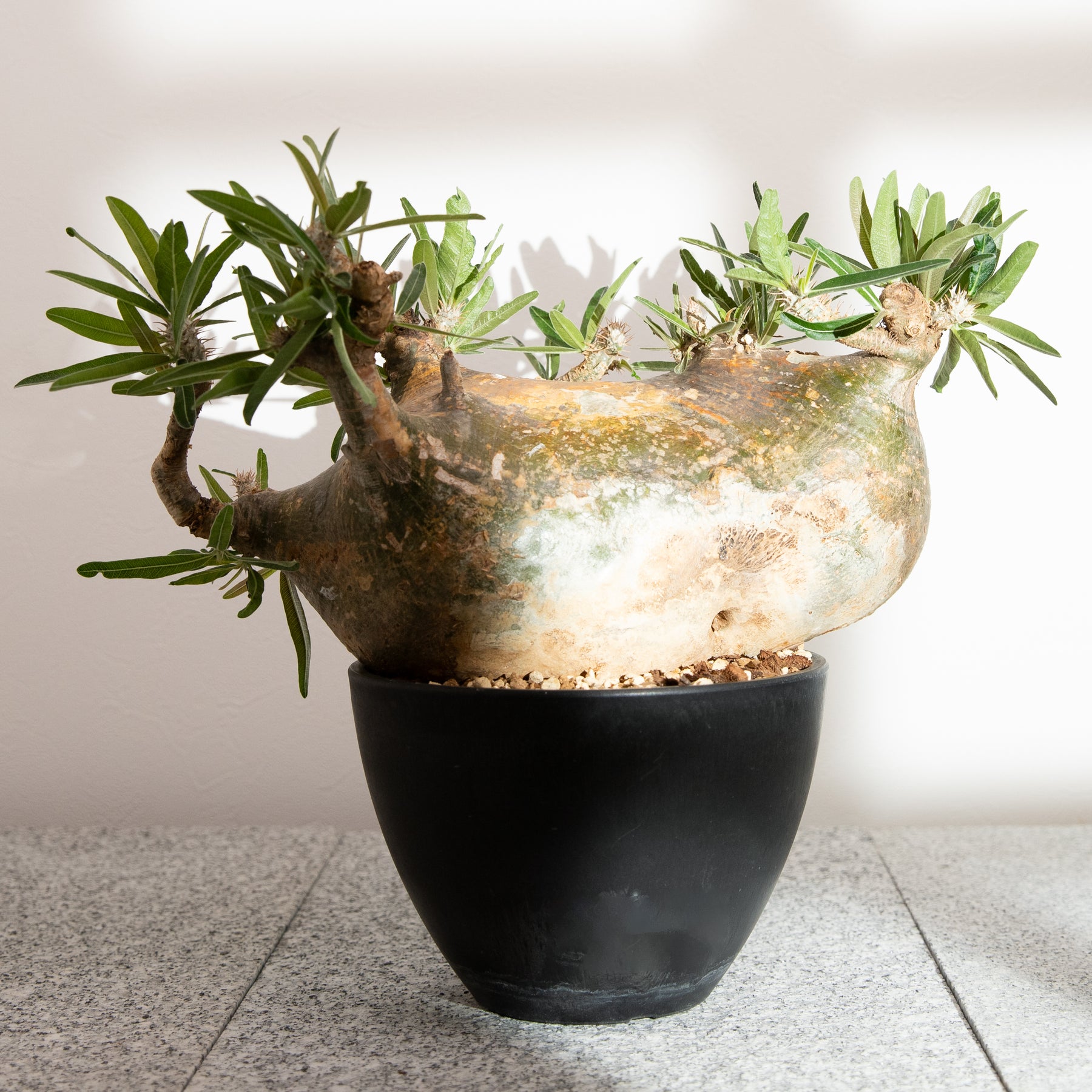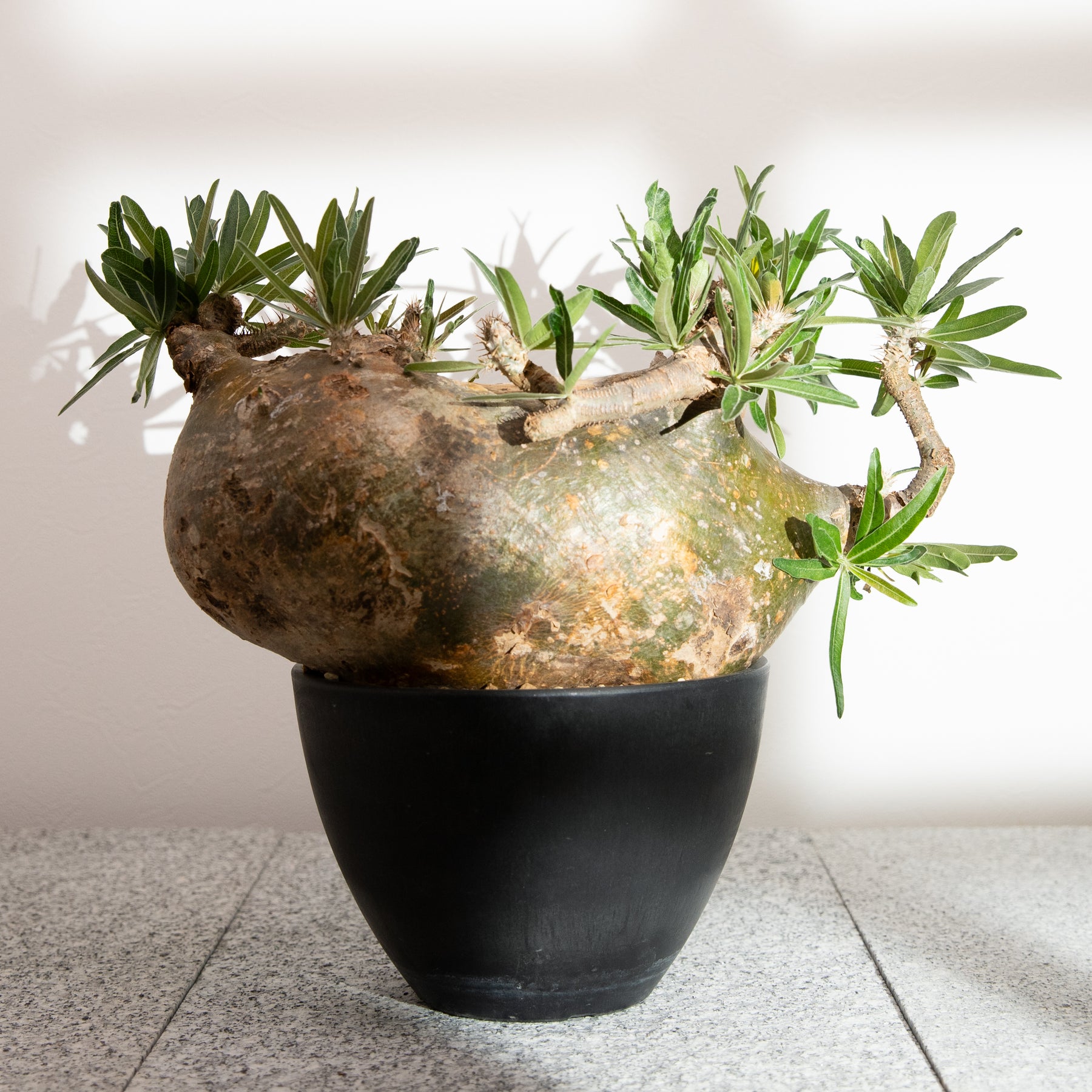 丸みを帯びた塊根と細い枝、涼しげな葉姿が魅力で、年月とともに風格を増す、存在感のあるコーデックスです。