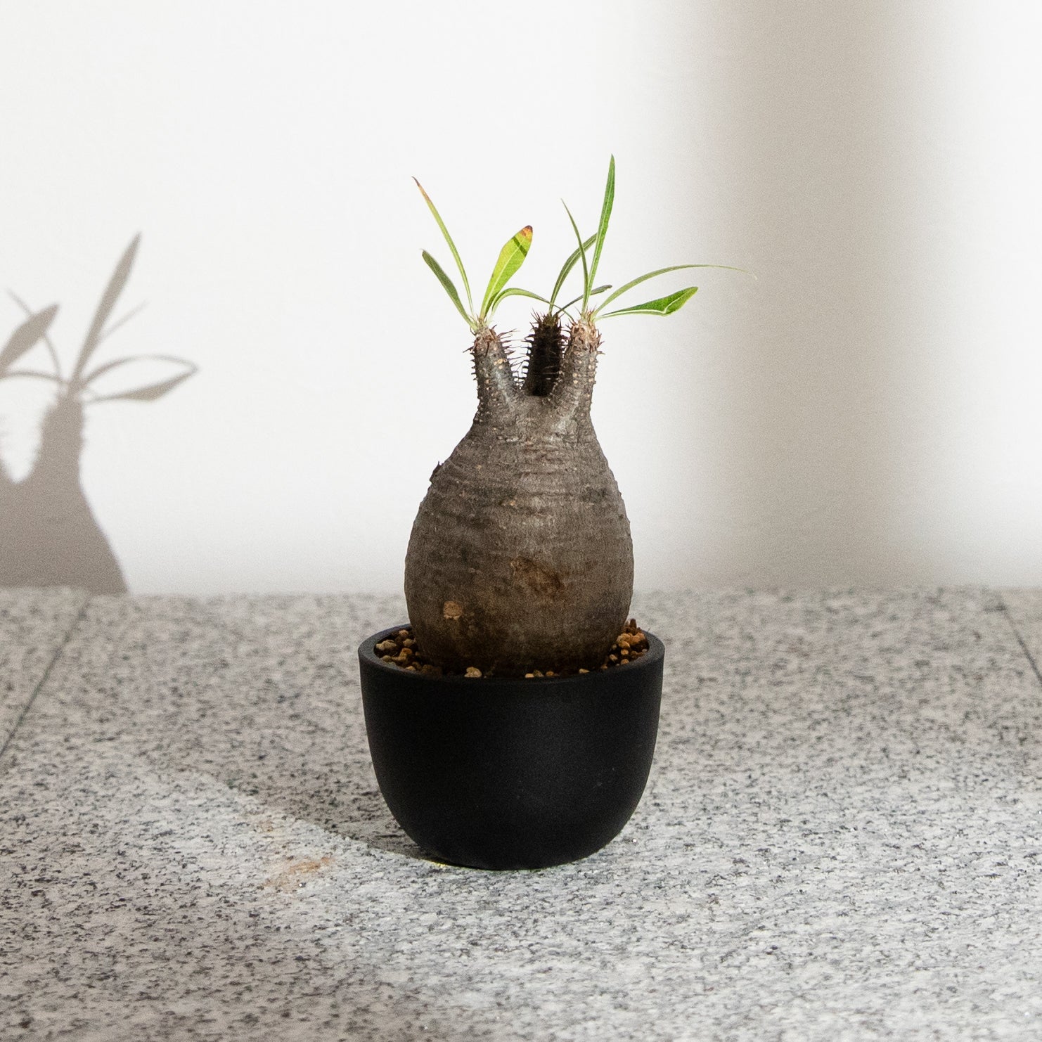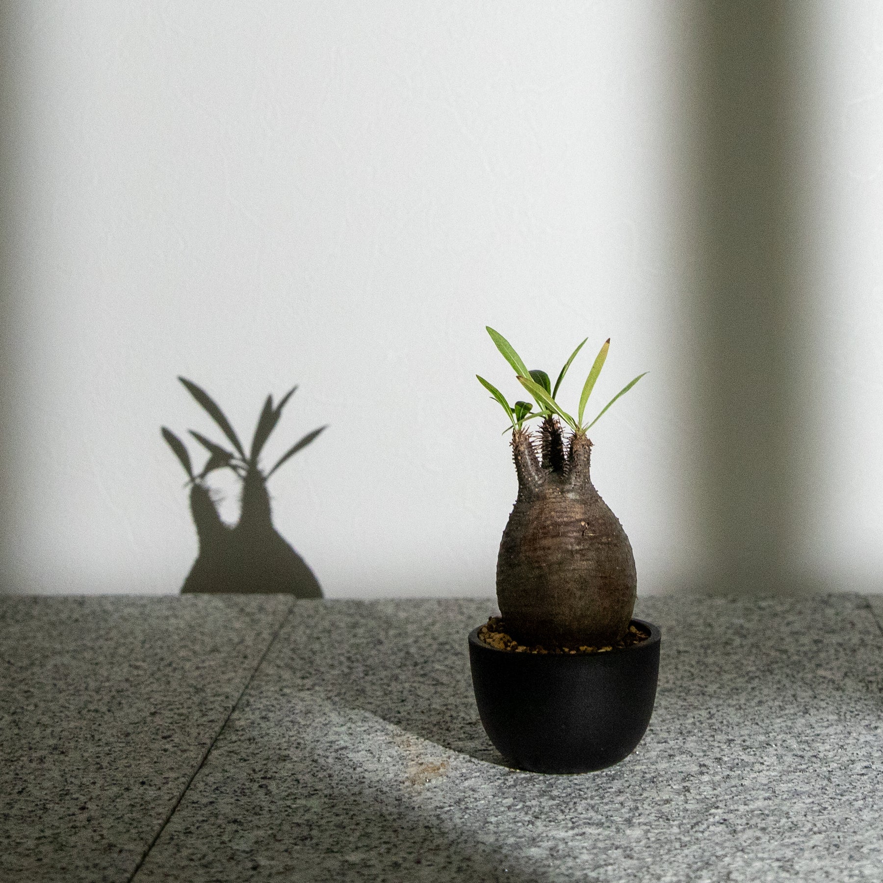 幹はまるで陶器のように滑らかで、光を受けるたびに表情を変えます。乾燥地帯に自生するため、強い日差しと乾燥に強く、屋内外で育てやすいのも人気の理由。育成環境や個体差により、その形やバランスが異なるため、「一期一会」の出会いが楽しめる植物でもあります。